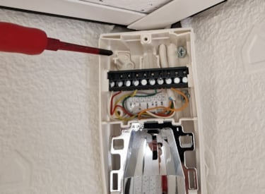 'Duidelijk te zien is dat de schroef niet op de juiste plaats zit. De afneembeveiliging wordt niet geactiveerd wanneer de melder van de muur gehaald wordt. Bij dit type melder dient bij risicoklasse 3 (EL3 / Grade 3) de schroef altijd linksboven te zitten.