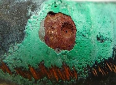 Figuur 2: Typerend schadebeeld in een doorsnede, bestaande uit een corrosieput die is bedekt met corrosieproduct waarbij een 'geperforeerd membraan' van afwijkend corrosieproduct de corrosieput afsluit. In dit geval had de corrosie op de onderzochte locatie nog niet tot perforatie geleid.