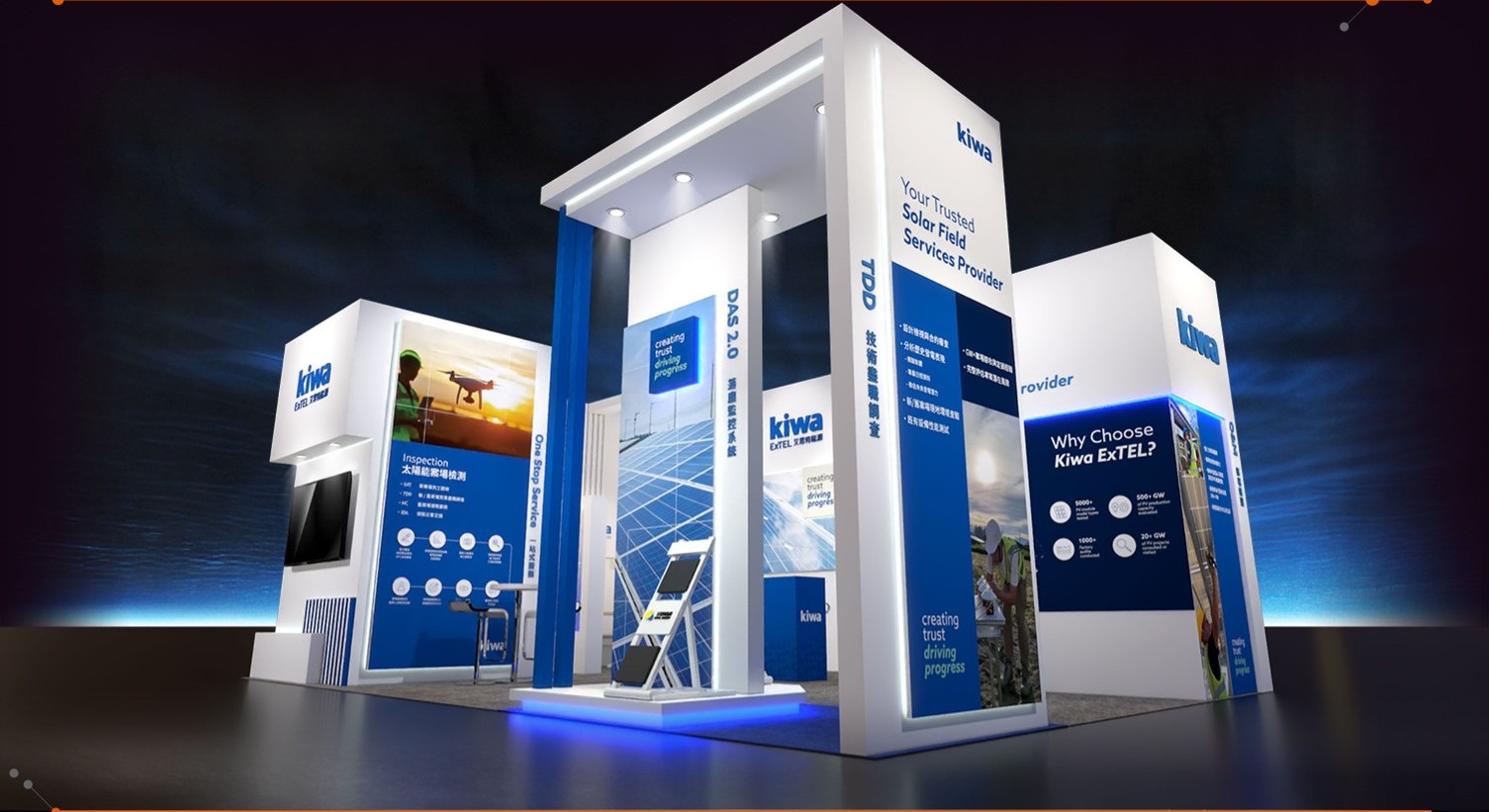 Kiwa ExTEL, a subsidiary of the Dutch testing and verification organization Kiwa Group, participated in the "2025 Energy Taiwan" exhibition this year, showcasing the brand's simplicity and professionalism with a blue and white themed booth design. The main wall of the booth featured the company's image as the main visual element, the main aisle was spacious and smooth, and the service wall was decorated with streamlined designs and professional lighting, creating a calm and sophisticated brand atmosphere that attracted the attention of many business participants.